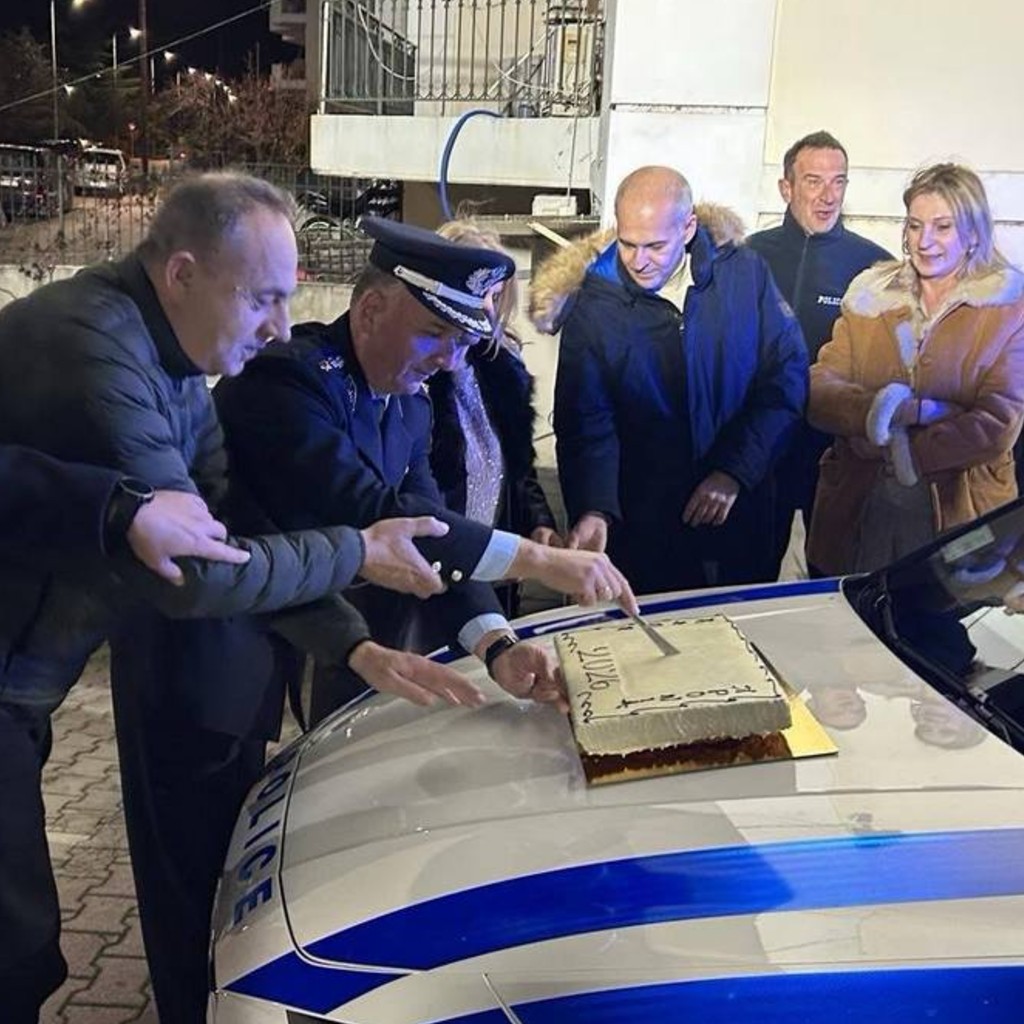 Το σκηνικό λιτό αλλά ζεστό: το περιπολικό μετατράπηκε σε αυτοσχέδιο τραπέζι και η βασιλόπιτα που προσέφερε η Ένωση Αστυνομικών Υπαλλήλων Φθιώτιδας έδωσε το σύνθημα για τη νέα χρονιά.
