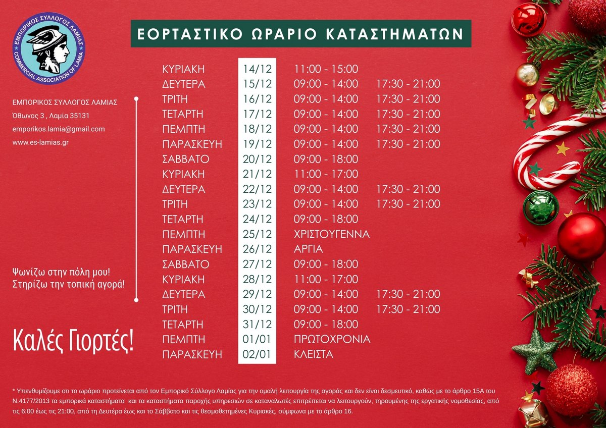 Τα Χριστούγεννα πλησιάζουν και μαζί τους η πιο έντονη περίοδος αγορών. Ο Εμπορικός Σύλλογος Λαμίας δίνει το έναυσμα της εορταστικής αγοράς από την Κυριακή 14 Δεκεμβρίου, με τα καταστήματα ανοιχτά για το κοινό.